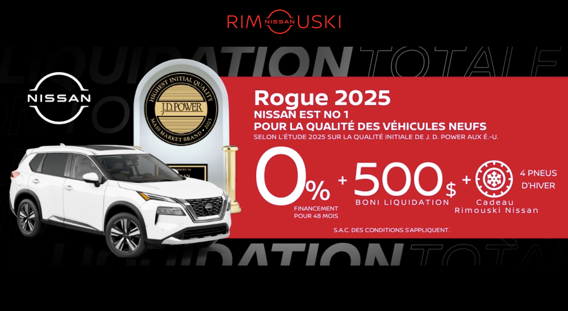 Nissan se classe au premier rang pour la qualité initiale des véhicules neufs parmi les marques grand public selon l’étude J.D. Power 2025 aux États-Unis. Pour souligner cette reconnaissance, Rimouski Nissan vous propose une offre exceptionnelle sur le Rogue 2025 : obtenez 0 % de financement pendant 48 mois, un boni de liquidation de 500 $, et un ensemble de 4 pneus d’hiver gratuits. Une occasion unique de rouler avec la qualité reconnue de Nissan, approuvée par les experts… et nos clients!